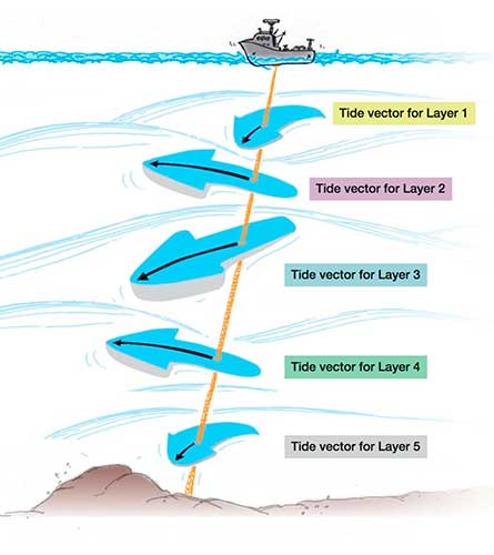 Tide speed and direction for the fifth depth layers are displayed with vectors. The depth of each layer can be set manually in 1 m intervals. Other information such as tide differential between the basic layer and the reference layer, heading and course can also be displayed in large text.