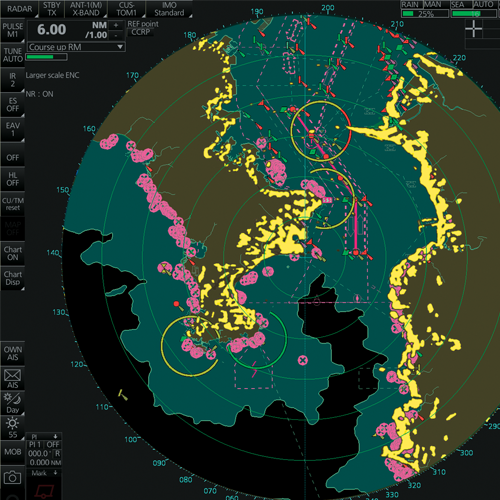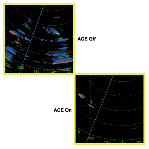 Automatic Clutter Elimination (ACE) is a new function that provides clear echoes. When activated, ACE automatically adjusts the clutter reduction filter and gain controls according to the sea and weather conditions selected from a preset list. Furuno’s advanced echo averaging architecture is incorporated into the function. Utilizing the ACE feature, users can avoid complicated adjustment processes, resulting in a much clearer image. Additionally, the FAR3000 series’ advanced Interference Reduction (IR) function ensures that valid target echoes do not shrink, even with IR on.