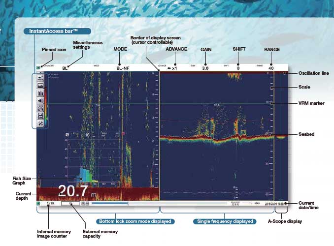 The FCV2100 can be operated easily and quickly with its trackball. The screen header also contains Range, Shift, Sensitivity, Image Feed, and Display Mode menus that can be immediately accessed when required. Other functions can also be accessed immediately by setting them in the InstantAccess Bar™ as desired*.