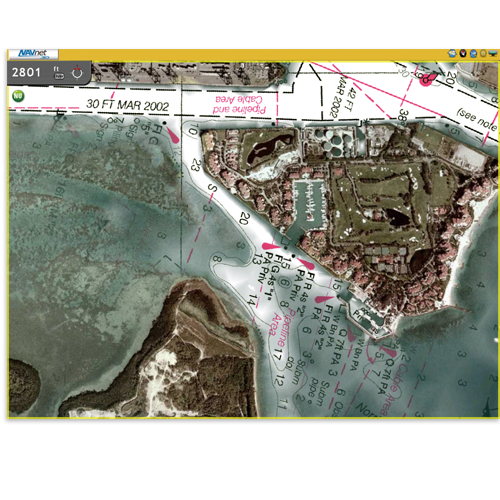 Satellite photography can be fused with raster or vector chart information. Land areas (zero depth) are completely opaque, so that these areas are displayed as satellite photos on the chart. As the depth increases, the satellite photography becomes more transparent so that you will know where the shallows end and the deeper water starts.