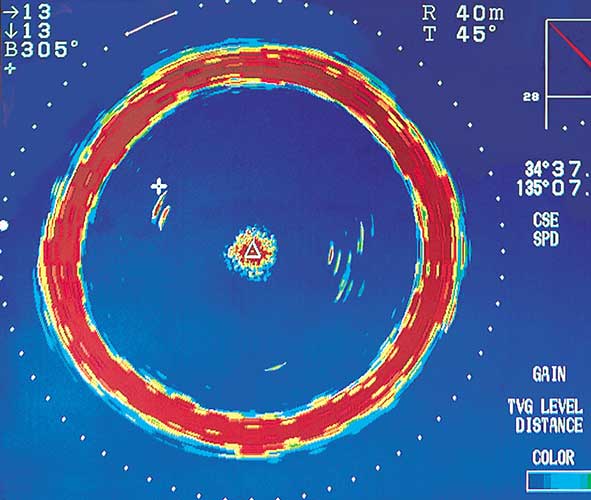 There are eight operational modes to choose from. Full circle scan helps to detect fish schools at any bearing, all around the vessel. Vertical slice mode gives you a fore and aft, surface to surface, expanded view of fish school distribution on the selected bearing. The combination full circle/vertical slice mode finds fish targets and bottom structure all around the vessel, with a vertical slice display at the same time. You can set it for a depth sounder mode, which has a tilt and train capability for forward or side looking. It is even stabilized against the boats motion. Full Circle with Video Plotter displays your ship's track with respect to the sonar sounding area - an unrivaled feature for purse seining. A unique Cross-Section mode let's you instantly view the vertical plane in a specified direction, useful for evaluating the concentration and location of fish schools, or as an aid to navigation.