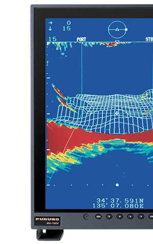 Full-circle scanning (with the capability of scanning a user-specified sector area in a reduced time) presents a picture like a scanning sonar with adjustable tilt for rapid location and tracking of fish targets. Vertical-fan scanning uses a fan-shaped sounding beam directed downward with up to 180° vertical sector coverage, presenting an echosounder-like cross section of the underwater situation. The Vertical-fan mode greatly supports your fish finding operation. It is also useful for monitoring the net shape and for bottomfish detection.
