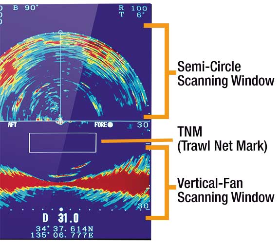 The Dual mode shows the vertical and horizontal presentation on the same screen. It is useful to evaluate the distribution of fish schools in both horizontal and vertical planes. A TNM (Trawl Net Mark) can be displayed at vertical plane on the vertical-fan scanning and dual modes. By inputting net height and width dimensions, the operator can overlay and visualize the net mouth opening.