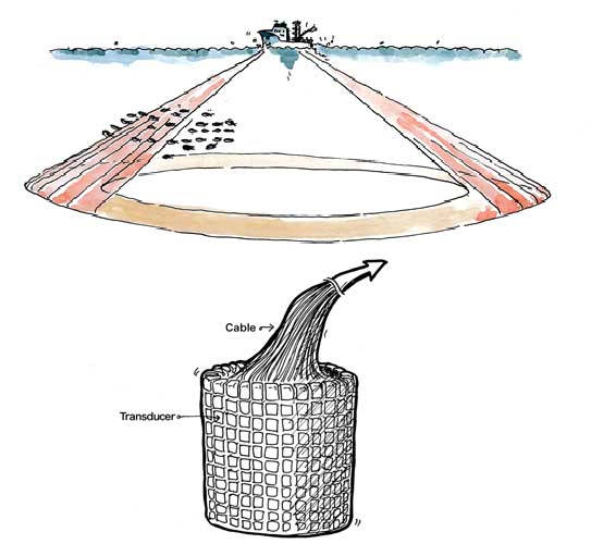The transducer arrangement consists of layers of elements. Each element is pointed in a slightly different direction which allows the Sonar to transmit 360 degrees simultaneously without rotating the transducer. The targets are redrawn on the display instantaneously according to the latest echo received from the transducer. Because this sonar scans quickly, it greatly improves the fishing operation, especially when searching for or following fast swimming fish.