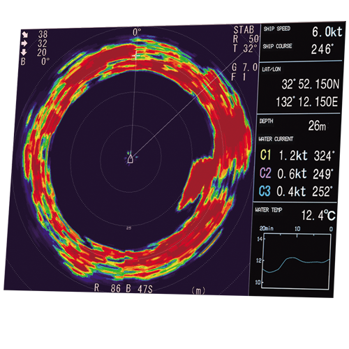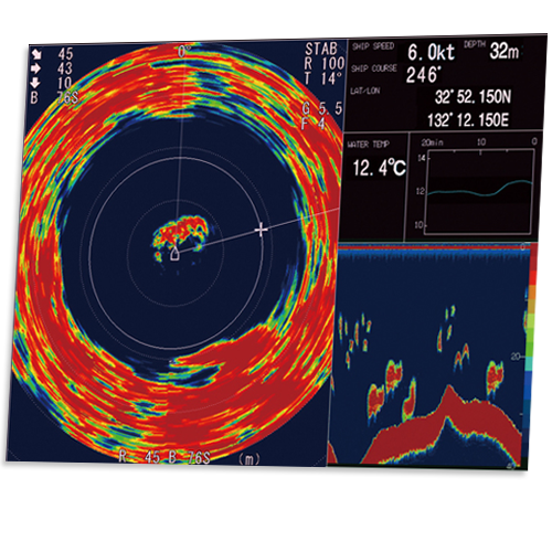 The Sonar picture appears on the left and the signal fed from the Echo Sounder at the lower right side of the screen. This mode is suitable for judging fish school concentration.