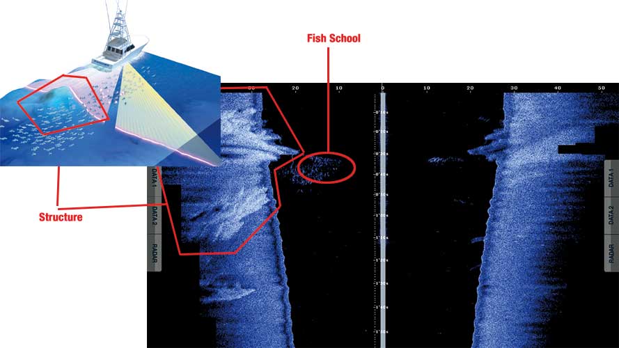 Cross section displays the real-time sea column echo in 120 degrees port and starboard. This mode aids in instantly understanding the distribution of bait fish and the water column condition, with a detection range of over 650 feet, depending on bottom, water and installation conditions.