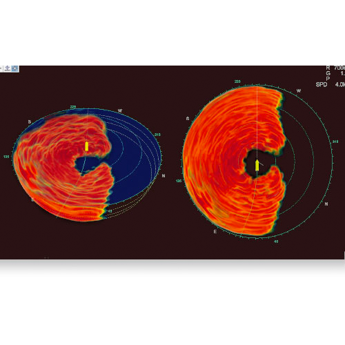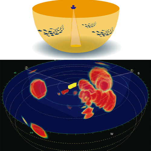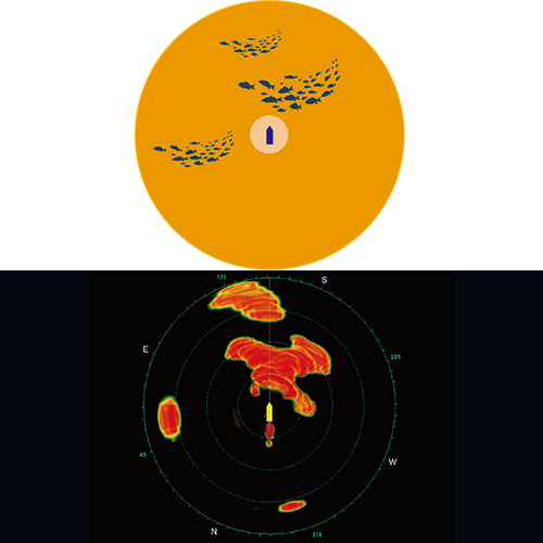 The Top-View mode displays all echoes in a single horizontal plane around your ship. This mode allows you to accurately assess the horizontal distance to a fish school and know its direction with precision.