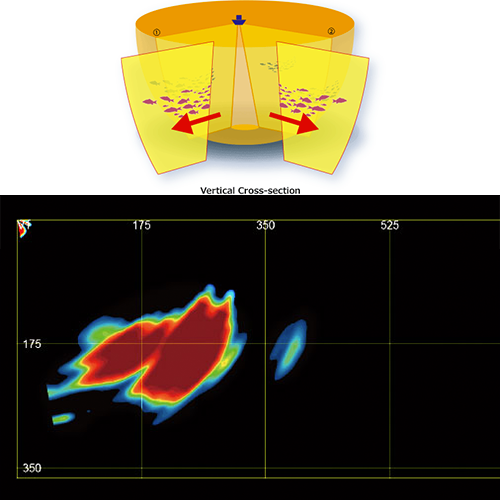 Fish schools of surface to middle layer can be observed at the same time, making it easy to see the exact distribution of fish schools at a glance. Easily deduce the optimum tilt angle of horizontal mode for simple and reliable monitoring of any object underwater.