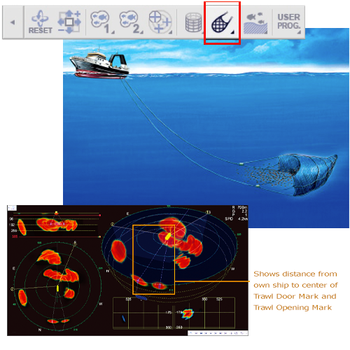 Display marks for the trawl door, net, and wire in the 3D representation image. When a fish school is detected, trawl marks assist in positioning the doors and net for a bigger catch.