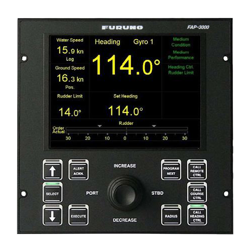 The FAP3000 has 3 Performance categories: Economy, Medium and Precise. Economy mode provides a more relaxed, fuel saving track mode, where Precise mode is the mode to select if the ship should follow the track tight. Loaded, Medium or Light can be selected to optimize the steering in relation to the ship loaded condition. Next Heading, Next Course or Next Radius can be programmed so it is ready when pressing the Execute Push button. The programmed setting is stored so the navigator can toggle between displaying the Next Programmed and Actual without loosing the Next Programmed setting. Course changes can be made with controlled radius of the turn. Each Mode (Radius, Heading, Course or Remote) are controlled by a 4 logically arranged buttons