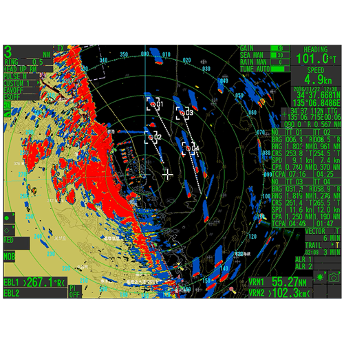 The FAR14x6 Radars are high-performance Radars with a 15" display that can be utilized in either a portrait or landscape orientation to fit your preference. When the Chart Radar presentation and chart map are overlaid, North-Up, Course-Up, and Head-Up direction modes are available. By overlaying Radar with high-quality MapMedia vector charts, you can easily recognize coastlines and buoys at a glance. Records of your vessel’s track points and waypoints will help memorize fishing points.