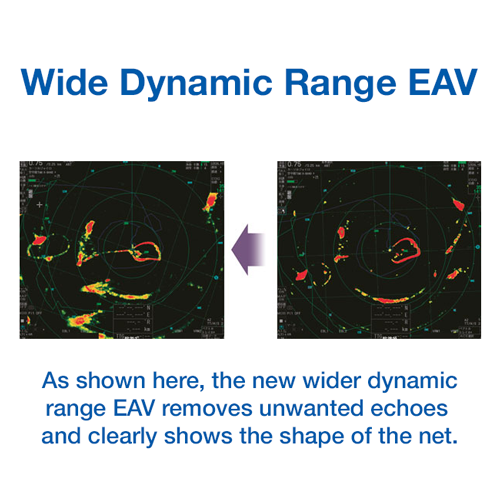 EAV is a signal processing technology that suppresses unnecessary echoes on the screen by utilizing image correlation techniques, making it easier to distinguish echoes from noise. The new wide dynamic range of the EAV function allows the display of both weak and strong echoes in vibrant colors.