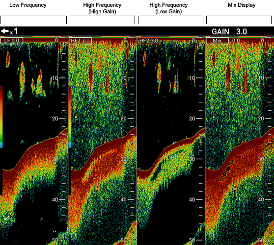 Use the Simultaneous Gain Setting to increase the visibility of the echo returns on the screen. Display two different gain settings simultaneously for increased visibility in changing water conditions and when changing vessel speed.
