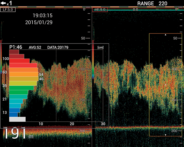 With a quick glance at the simple and efficient graph, you can get all the information you need to identify fish size and distribution. Once you know the fish size and its distribution, you can use this information to estimate the species and whether it's a viable target or not. Together with the TruEcho CHIRP™ technology, the FCV1900G allows you to choose the best position to throw your net. Then, based on the fish size graph, you can choose the right mesh size for efficient operation.