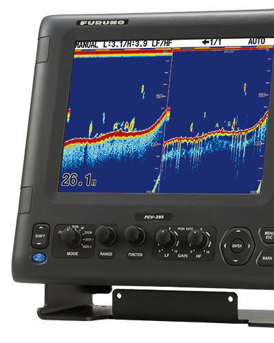 The Furuno Free Synthesizer (FFS) Transceiver allows a wide selection of operating frequencies. You may choose any two frequencies between 28 and 200 kHz to fit your fishing operation. Output power is selectable from 1, 2 or 3 kW. A wide variety of display modes and functions are available, which provide skippers with simple and intuitive information. Furuno Digital Filter (FDF) optimizes the gain to obtain highly defined images of underwater conditions. It can clearly show target fish close to the seabed.The digital filter also eliminates noise to deliver sharp and detailed echo presentation, achieving detection of fishing reef and even individual fish with absolute clarity.