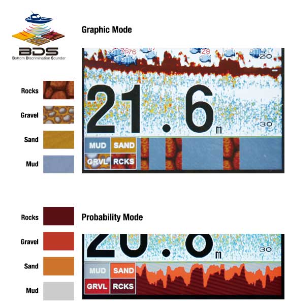 The standard graphic display mode shows the most probable bottom composition graphically or in four colors.