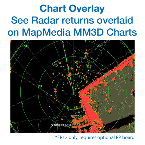 With the optional RP board installed, the FR12 can display Radar echoes overlaid onto MapMedia mm3d charts. Marks and Lines created on a networked GP3700/F GPS Chart Plotter can also be displayed.