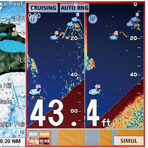 The Accu-Fish feature is a revolutionary fish size assessment function that can tell you the approximate size of the fish below your boat. Fish symbols appear on the screen, along with the size of the fish or the depth where it found the fish. It can detect fish size from 4 inches up to about 6 feet long, in depths of 7 feet to well over 300 feet of water. Accu-Fish signal processing blends the high and low frequencies to depict fish targets of all types simply, clearly and distinctly. Now, fishermen can clearly and easily distinguish big billfish around a bait ball, or see through bait and trash fish on the surface to target "the big one" below.