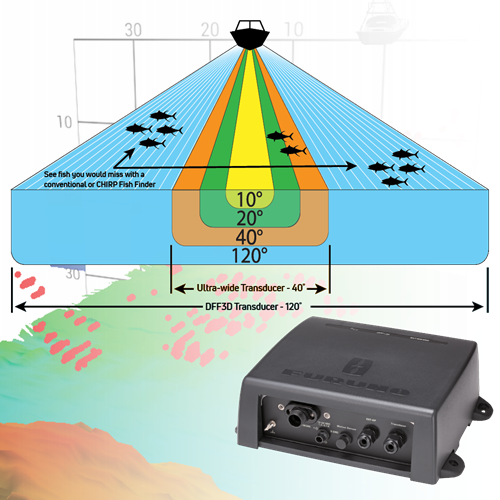 Normal down-sounding Fish Finders have a beam angle of 40˚ or less. But with the DFF3D Multibeam Sonar, you see 120˚ port-starboard for 200m (650+ ft). Plus, with the power of the DFF3D, you can see fish directly below the boat 300m (nearly 1,000ft). When you match this with the Deep Impact TruEcho CHIRP™, you’ll have the ultimate fishing machine!