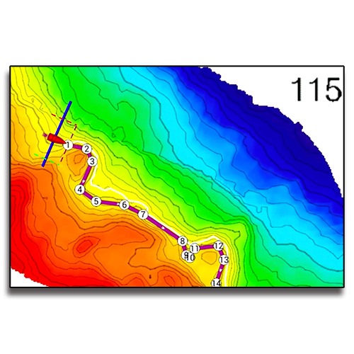 The amazing Follow-It feature leverages the power of PBG (Personal Bathymetric Generator) from your DFF3D Multibeam Sonar to instantly create a constant-depth route to navigate a specific depth contour. With just a swipe and tap, Follow-It creates a white line on the PBG chart indicating the constant depth. Tapping the line instantly transforms it to an active route, sent directly to your NavPilot Autopilot. NavPilot will follow the depth route all the way around a ridge or trough. By following specific depth contours, fishermen can keep their baits at the same level as the fish while trolling without constantly adjusting the reels. Having your bait at the correct depth is critical to catching fish in areas where tide and currents flow along structure where gamefish concentrate.